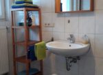 Das Bad verfügt über eine Badewanne mit Glas-Duschwand, ein Waschbecken und WC.